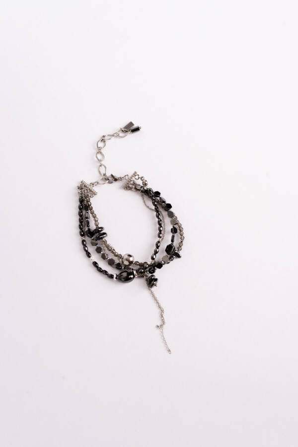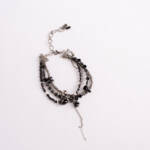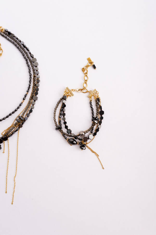 Этот браслет повторяет эстетику колье — многослойность, текстуру, мерцающий гематит и изящные цепочные акценты. Он мягко обхватывает запястье и красиво подчёркивает движения руки, создавая эффект деликатного блеска.