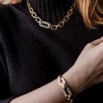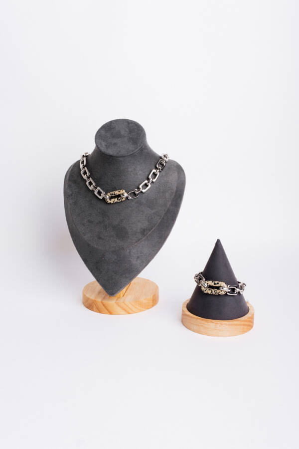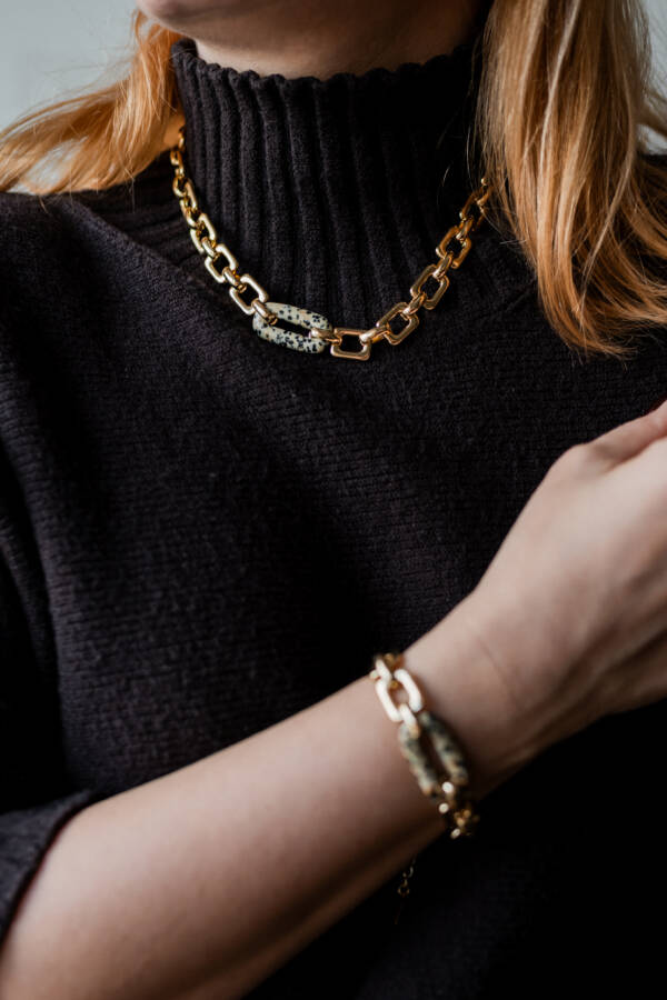 Крупная цепь в оттенках позолоты или родия соединяется с природным камнем яшма далматин, который придаёт образу характер и глубину.