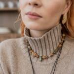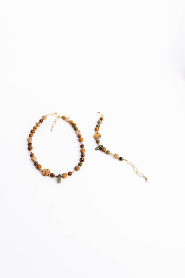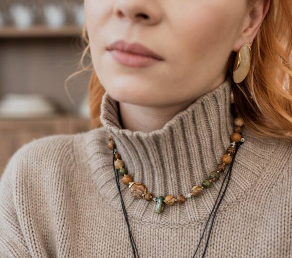 Природные оттенки камня делают колье особенно живым и глубоким. Оно не спорит с образом, а мягко подчёркивает его, добавляя естественность и стильную осознанность. Такое украшение выглядит дорого, но ненавязчиво — именно в этом его особая эстетика.
