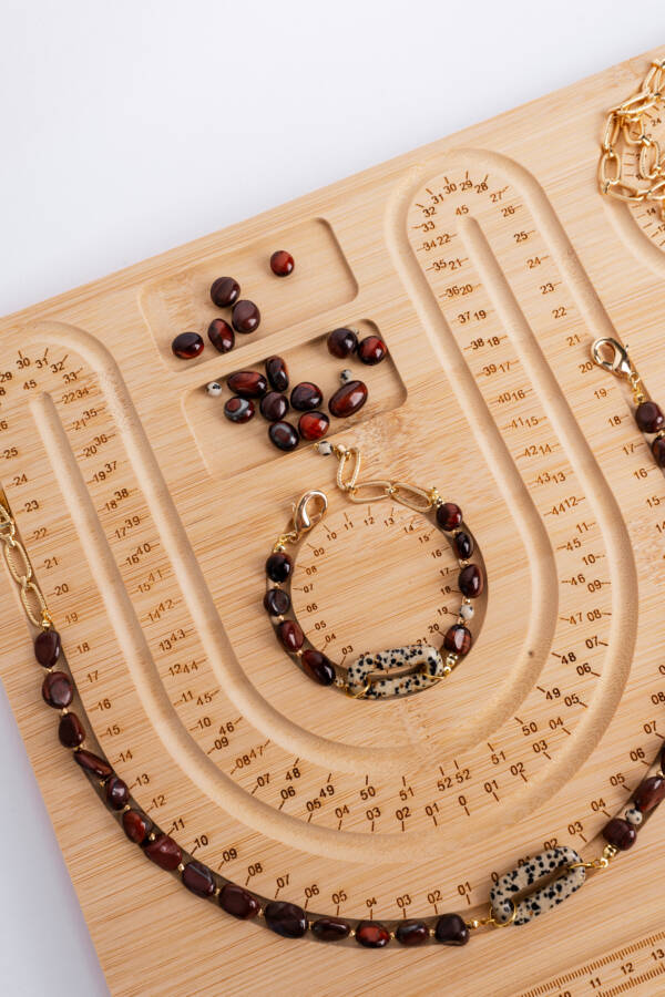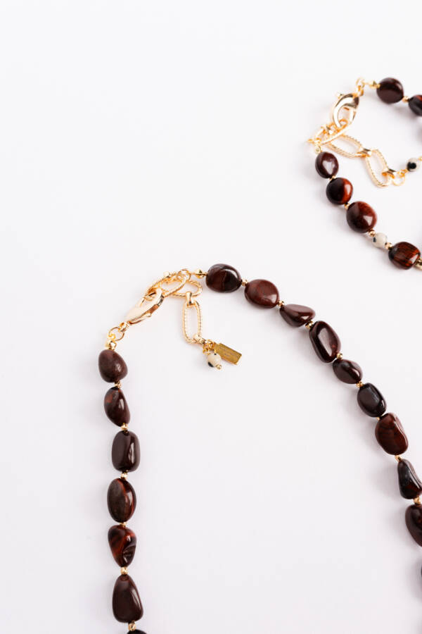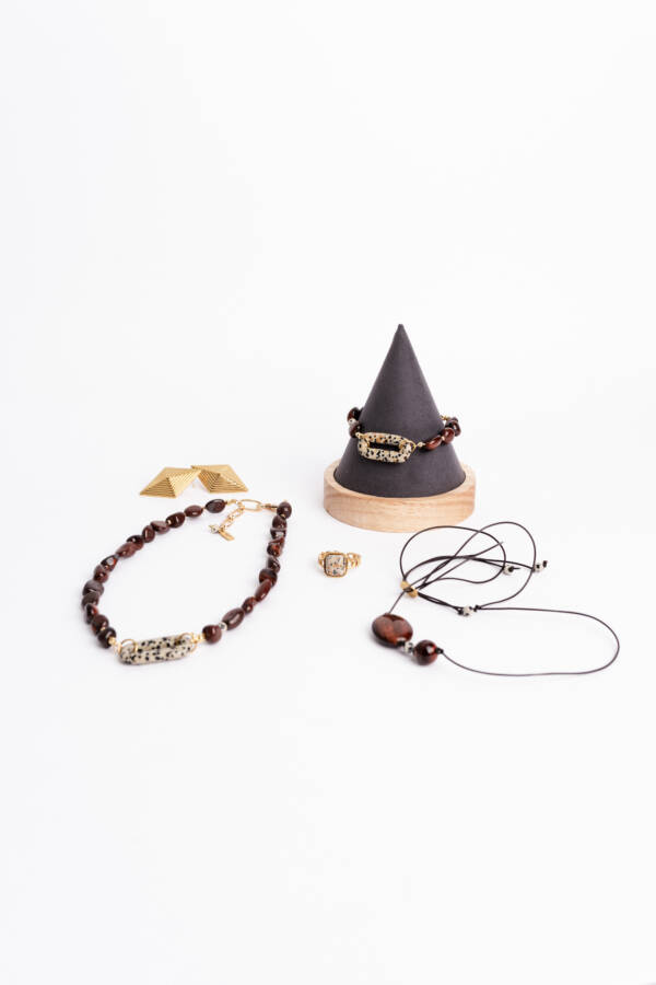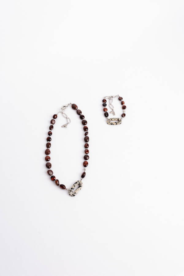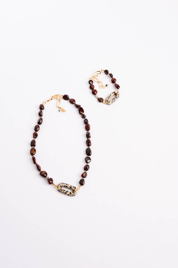 Два украшения — чокер и браслет — созданы, чтобы усиливать энергию друг друга. Красный тигровый глаз даёт уверенность, яшма далматин наполняет лёгкостью. Вместе они создают баланс: страсть и спокойствие, сила и нежность, действие и присутствие.