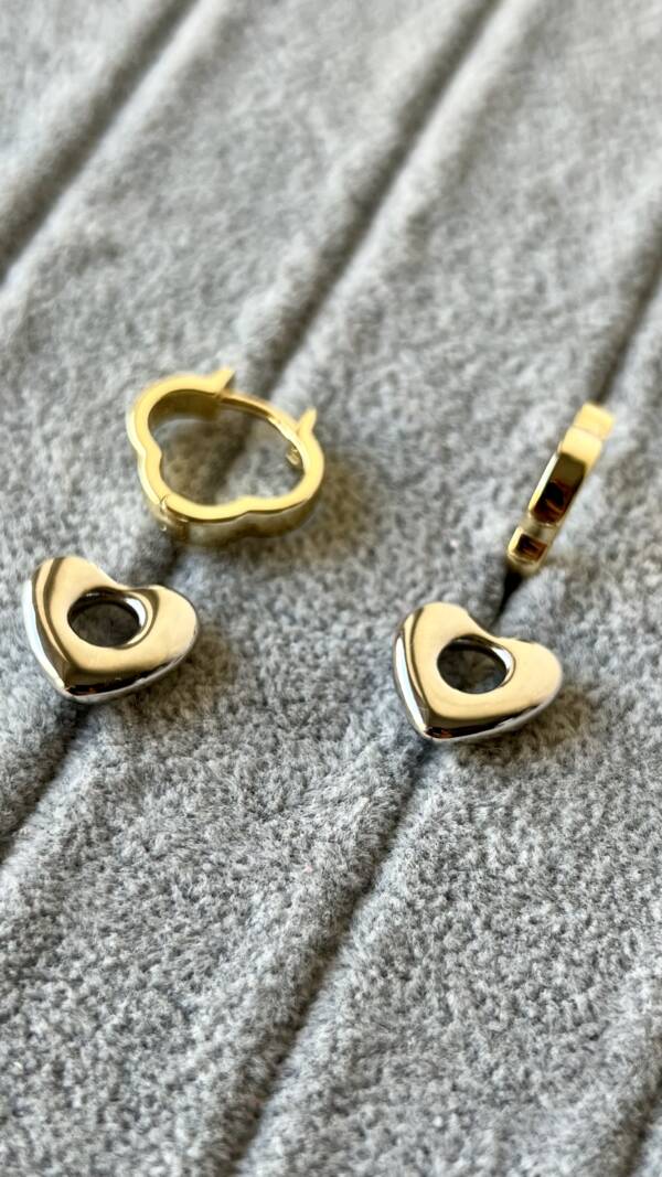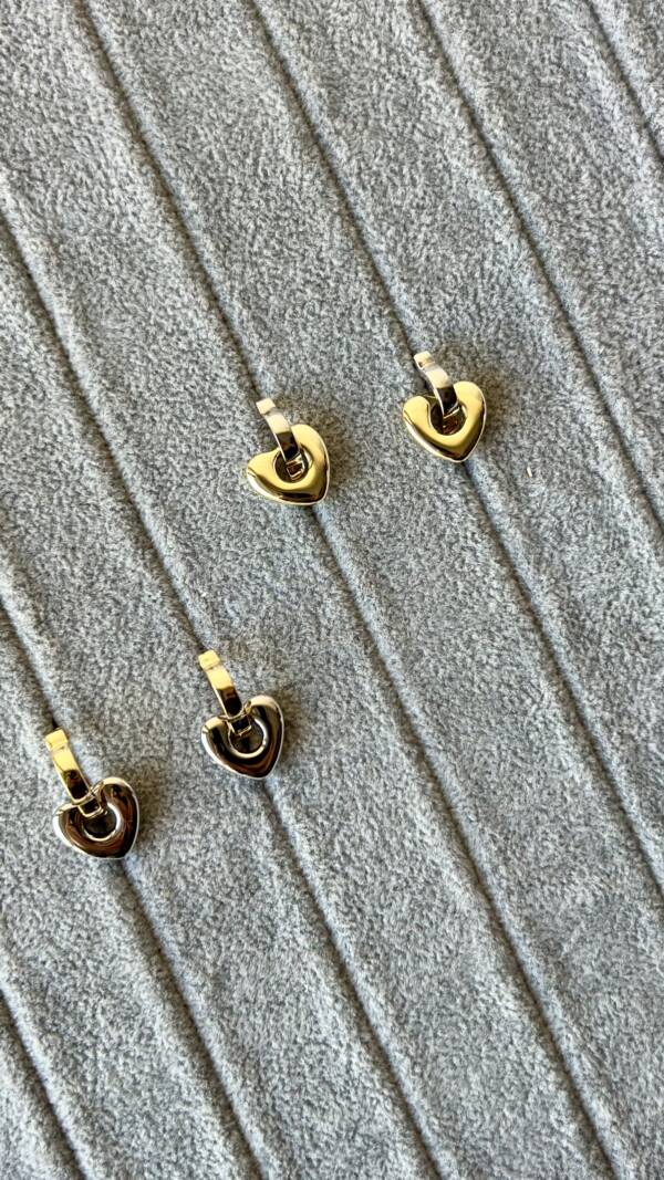 Базовая форма — лаконичные кольца, которые можно носить отдельно. А если добавить подвески в виде миниатюрных сердечек — образ сразу приобретает акцент, лёгкий блеск и энергию.