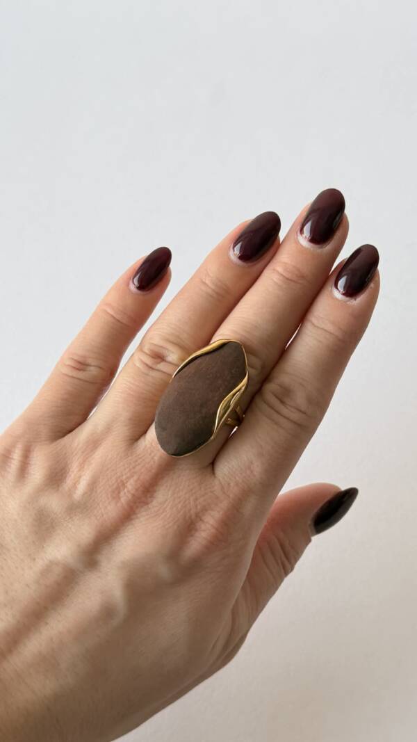 Statement-кольцо из эпоксидной смолы привлекает внимание своей формой и уникальным рисунком, который невозможно повторить.