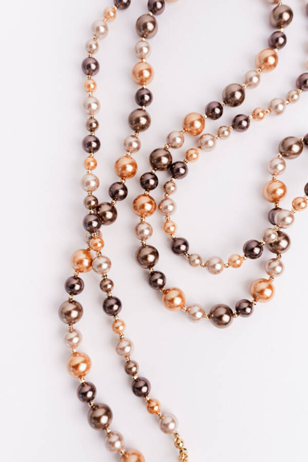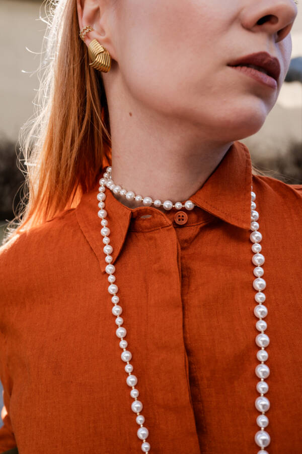 Жемчуг Майорка обладает приятной текстурой и благородным внешним видом, идеально дополняя осенне-зимние образы. Это украшение прекрасно подходит как для вязаных изделий, так и для футболок, а также эффектно смотрится поверх пальто и пиджаков.